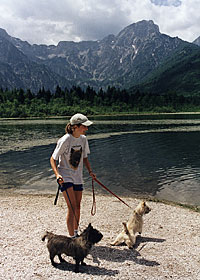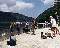 | Cairn-Aktiv-Treffen in Grünau im Almtal am 30.6.2001 Am Samstag, den 30.6.2001 trafen sich 22 Hyde-Castle-Freunde mit 16 Hunden beim Gasthaus Jagersimmerl in Grünau im Almtal. Pünktlich um 10 Uhr starteten die wanderfreudigen Zwei- und Vierbeiner bei strahlend schönem Wetter zu einer traumhaften schattigen Tour um den Almsee, die unser Wanderleiter Herr Schallmeiner mit Gattin und "Cairn-Terry" für uns ausgesucht hat. Besonders weit angereiste, aber bereits schon gute Bekannte in unserer Runde, Familie Heimrich und Freunde aus Deutschland und erstmals ein Amerikaner in Ungarn waren mit dabei, der "harte Kern" von Cairn-Aktiv sowieso. Nach unserer Seewanderung landeten wir wieder beim Jagersimmerl und verbrachten den Rest des Nachmittags in gemütlicher Runde. Unser Wanderziel war eine Reise wert und so mancher überlegt nun, nochmals für ein paar Tage dort hin zu fahren. Wir haben es nicht bereut, den langen Weg ins Almtal gemacht zu haben und unsere Hunde haben sich mustergültig in diesem wunderschönen Naturschutzgebiet verhalten und die kleinen Pausen mit Bademöglichkeit kräftig genutzt. Ich bedanke mich bei allen fürs Mitmachen und freue mich schon auf unser nächstes Treffen, das wanrscheinlich im Herbst stattfinden wird. |