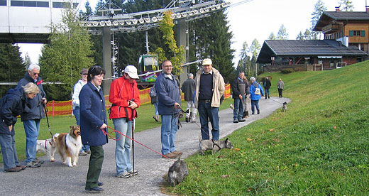 | Zur Bildergalerie Der letzte Wandertag im heurigen Jahr führte uns in eine wunderschöne Gegend, die ich bei meinem Junior-Handling-Camp im Sommer kennengelernt habe. Es war diesmal Wagrain im Pongau/Salzburg. Wir hatten wie immer Kaiserwetter und machten mit den Hunden eine Gondelbahnfahrt mit Flying-Mozart zur Mittelstation und von dort auf einem bequemen Forstweg zuerst etwas steil aber kurz bergauf und dann gemütlich 2 Stunden bergab über den Dartmoorspeicher zurück nach Wagrain. 22 Zweibeiner mit 16 Vierbeinern, davon ein Collie und 1 Spaniel waren mit von der Partie und allen hat es gefallen. Ein kleiner Nervenkitzel war unfreiwillig eingebaut, wir mußten nämlich über eine hübsche Almwiese, die aber seit kurzem von Jungtieren mit ihren Müttern begrast wird, aber brav wie unsere Hunde sind, haben wir uns alle einige mit Überwindung an ihnen lautlos vorbeigeschlichen. Der Abschluß fand im Berggasthof Widmoos bisher unser elegantestes statt und fand bei herrlichem Sonnenschein am späten Nachmittag noch bei Kaffee auf der Terrasse mit Traumausblick sein Ende. Die Weitestangereisten waren Fam. Annaker aus Thüringen und der älteste Wanderhund war mit 14 1/2 Jahren die Schwester meines unvergessenen Little LIZZY aus Gänserndorf. Nächstes Jahr treffen wir uns wieder wie immer am Ostermontag irgendwo im Osten Österreichs. Bis dahin Servus und Wuff! Elfriede Heidecker Rückblick Wanderung Schloss Hof im Marchfeld/Niederösterreich Samstag, 17. April 2006 Bericht Wanderung Grüner See/Steiermark Samstag, 24. September 2005 Bericht Wanderung Langbathseen/Oberösterreich Samstag, 26. Juli 2005 Bericht Rundwanderung Tulln/Niederösterreich Ostermontag, 28. März 2005 Bericht Wanderung am Natterer Boden/Innsbruck 22. August 2004 Bericht Rundwanderung Sophienalpe/Wien Ostermontag, 12. April 2004 Bericht Wanderung um die Burg Lockenhaus/Burgenland Sonntag, 05. Oktober 2003 Bericht Spitz an der Donau/Nö 21. April 2003 Bericht Raach am Hochgebirge/Nö 20. Oktober 2002 Bericht ...durch das Habachtal/Nö 1. April 2002 Bericht Admont im Ennstal/Steiermark 7. Oktober 2001 Bericht Gruenau im Almtal/Oberösterreich 30. Juni 2001 Bericht Wanderung über die Nussdorfer Weinberge/Wien 16. April 2001 Bericht Cairn-Aktiv-Treffen in Etmissl/Steiermark 2. Juli 2000 Bericht |
